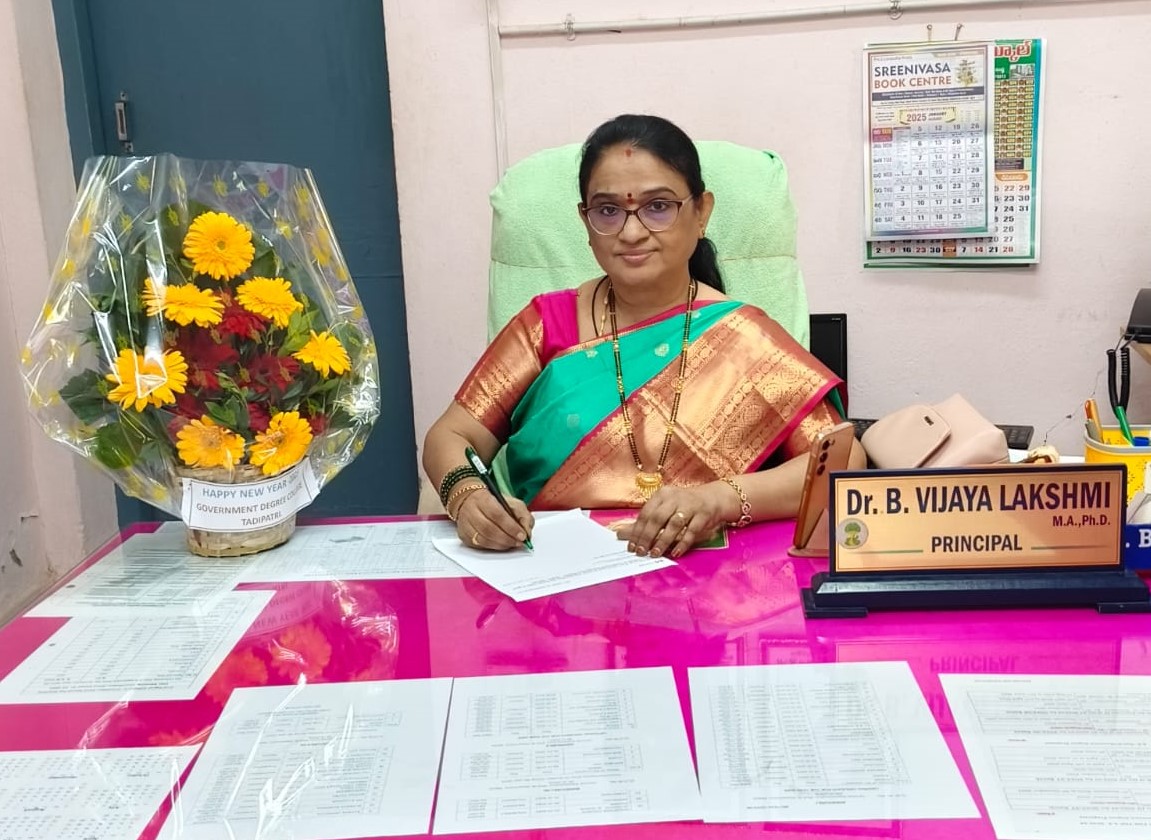 Dr.B.Vijayalakshmi, D/o Sri.B.Sree Ramulu Naik has been appointed as a Principal at Government Degree college, Tadiparei on 1-10-2021. Before that she workes as a Economics lecturer at various Government Degree Colleges nearly 23 years.She had completed her Ph.D degree on the topic of "Socio Economic conditions of Tribal Women - A case study of Anantapur District in AP" under the supervision of from SK University in 2006.She is very active and dynamic towards the academic activities. She is very sincere and honest towards her duities. She has attended so amny seminars and publishes different kinds of papers regaarding ther research.